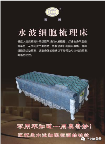 五洲水波細(xì)胞梳理床是依循大自然順時(shí)針雙螺旋氣場的水波原理,根據(jù)人體工程學(xué)和生命科學(xué)而精心研發(fā),結(jié)合氣功、中醫(yī)經(jīng)絡(luò)學(xué)、全息療法、血液循環(huán)學(xué)等東方醫(yī)學(xué)與現(xiàn)代科技為一體,集結(jié)尋癥、復(fù)健、保健、按摩、美容、運(yùn)動(dòng)、氣動(dòng)等七種強(qiáng)大功能于一身,它以高頻率螺旋順時(shí)針運(yùn)動(dòng)的方式與人體氣血循環(huán)全息共振,使人體的經(jīng)絡(luò)通暢,帶動(dòng)氣血循環(huán),改善五臟六腑的功能,從而達(dá)到增強(qiáng)自身免疫力、自愈力和對疾病癥狀的改善和康復(fù)的目的,床體是由經(jīng)絡(luò)氣血通和能量水療床組成。