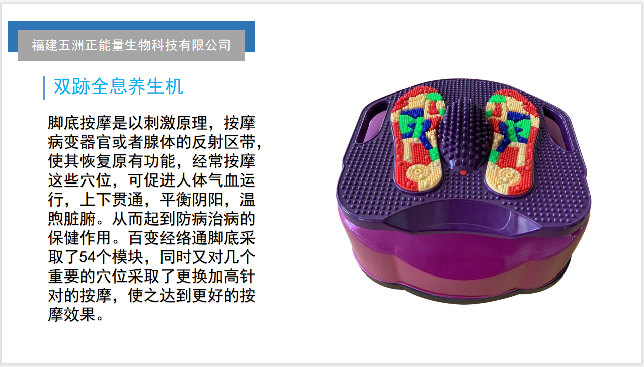 古代的中國(guó)醫(yī)家認(rèn)為“人之有腳,猶如樹(shù)之有根,樹(shù)枯根先竭,人老腳先衰”。中醫(yī)認(rèn)為,人有四根,即:鼻根、乳根、耳根和足根?!氨菫槊绺[之根、乳為宗氣之根、耳為神機(jī)之根、腳為靈氣之根”。這就說(shuō)明:鼻、耳、乳是人體精氣之凝聚點(diǎn),而腳才是精氣總的集合點(diǎn)。它是表達(dá)我們?nèi)梭w健康狀態(tài)的最好指標(biāo)。觀之臨床,頭腦清靈、肢體柔軟、步履輕健,情緒平衡均為健康的特征。離心臟最遠(yuǎn)的腳底便是骯臟血液容易滯留的地方,腳底有許多微細(xì)管,只要有一點(diǎn)點(diǎn)的污垢就會(huì)引起阻塞。例如說(shuō):某器官有異常,很快就會(huì)在腳底的對(duì)應(yīng)反射區(qū)有關(guān)聯(lián)的部分長(zhǎng)出硬塊或覺(jué)得疼痛。反之,從疼痛和硬塊的產(chǎn)生,也能發(fā)現(xiàn)潛在的或顯老疾病。老化是從腳開(kāi)始的,疲勞會(huì)出現(xiàn)在腳部。膝以上十公分以下的部分稱(chēng)為腳部,“腳是人體的第二心臟”,它蘊(yùn)藏著健康的泉源。通過(guò)對(duì)腳部反射區(qū)的按摩刺激,能喚起人體內(nèi)部的各個(gè)細(xì)胞、各個(gè)生理組織系統(tǒng),發(fā)揮出人體自然的自愈能力,達(dá)到治療與保健的效果。所謂“腳是人體的第二心臟”,這是因?yàn)樾呐K起著血泵的作用。從心臟壓出去的血液,流向身體每一部分的毛細(xì)血管,要流到距離心臟最遠(yuǎn)的腳上去,當(dāng)然就更困難了。只有借助于腳的走路,使肌肉起到伸縮運(yùn)動(dòng),幫助以及發(fā)揮著血泵的作用,改善血液循環(huán),我們以適應(yīng)的力量,刺激腳部這個(gè)“人體的第二心臟”,更可減輕以及的血行負(fù)擔(dān)和改善血液循環(huán),充分發(fā)揮血液循環(huán)對(duì)人體健康的作用,但因?yàn)槌鞘谢同F(xiàn)代交通工具的發(fā)展,步行這一有利于人生健康長(zhǎng)壽的方式就被省略了。雙跡全息養(yǎng)元機(jī)應(yīng)運(yùn)而生,它是中老年人、尤其是城市人和上班族的**選擇。